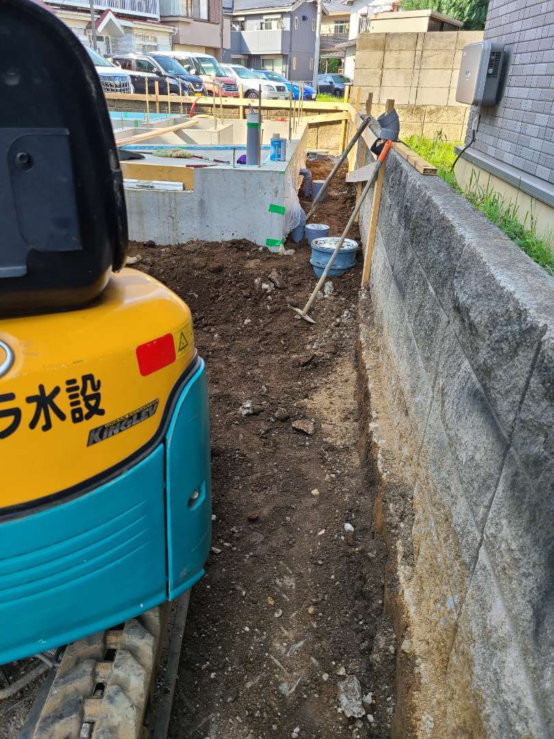 今日も晴天に恵まれ暑い一日になりました、建て方前に行う工事で給排水工事が今日で終えることが出来ました、明日は基礎の周りに砂利を引いて土間養生シートを引いて建て方までの準備が終えます、天候にも恵まれ予定している工事が終えることが出来ます。