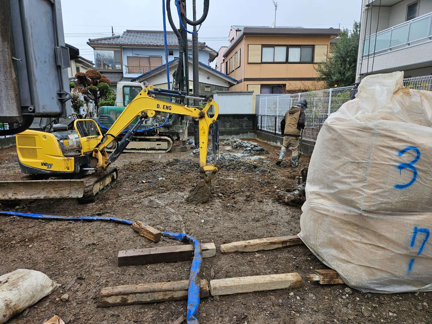 今朝も冷たい小雨になりました、朝一番に重機が入り材料を入れ地盤改良補強杭9メートル深さの工事が始まりました、明日の祭日はお休みを頂いて24日の土曜日に残りの杭工事を行う予定です。