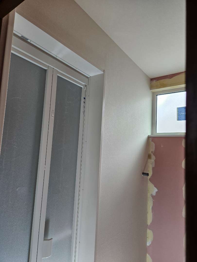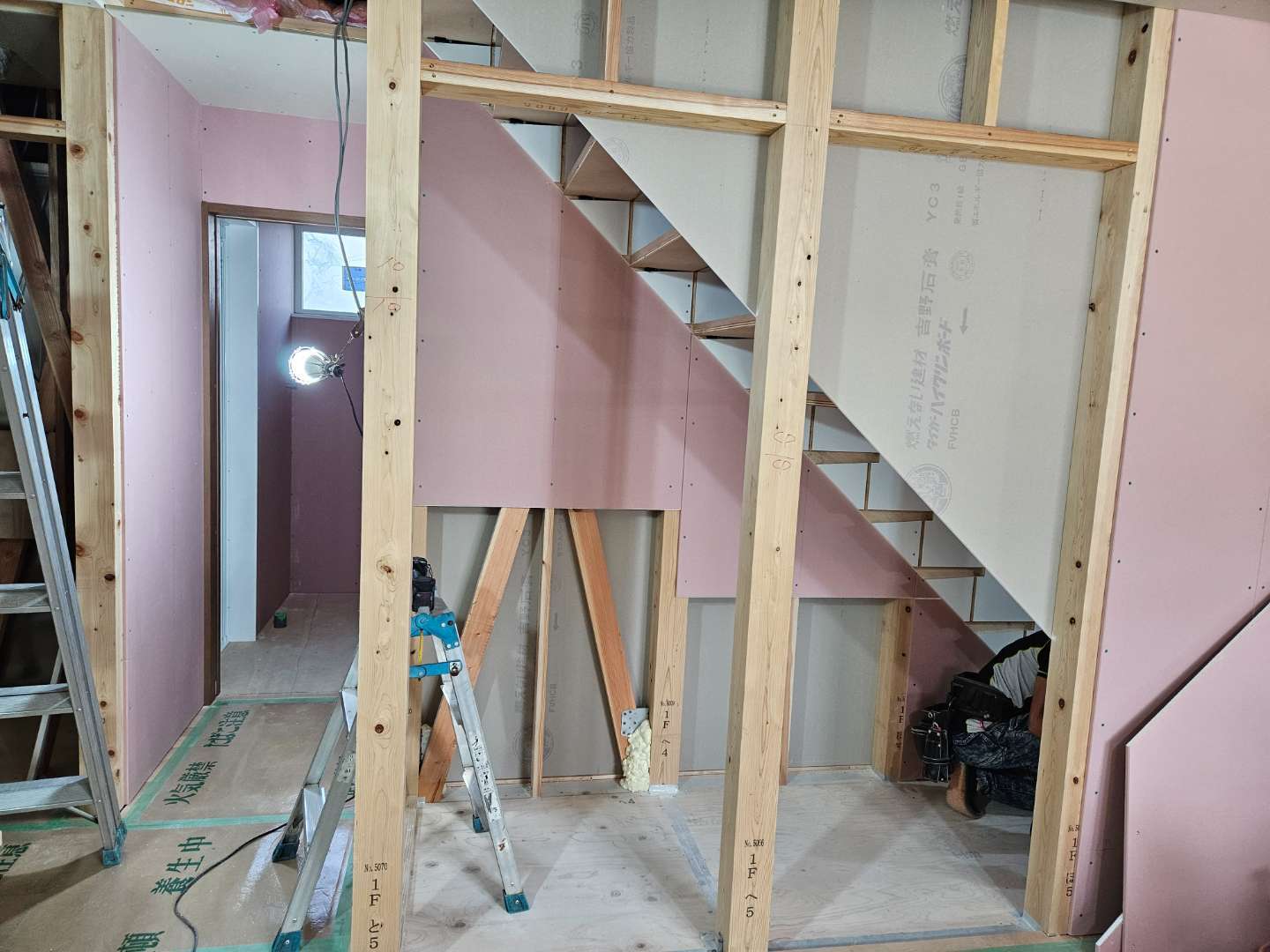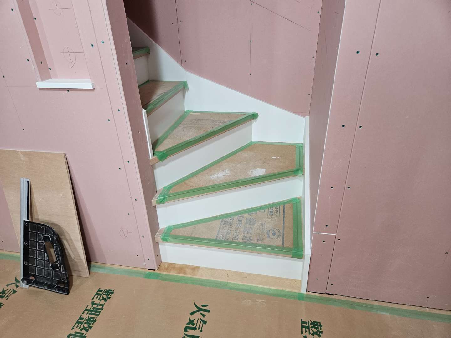 今朝も薄曇り空でしたが雨が降ることはありませんでした、太陽光発電とともに分電盤や接続箱を取り付けるために洗面所の一部分の壁と天井を仕上げの紙クロスを張っていただきました、来週には電気工事を行い太陽光からの電源がつながる予定です、木工事も進み1階から2階と2階から小屋裏階段も取りつきました、仕上げが見えてきました。