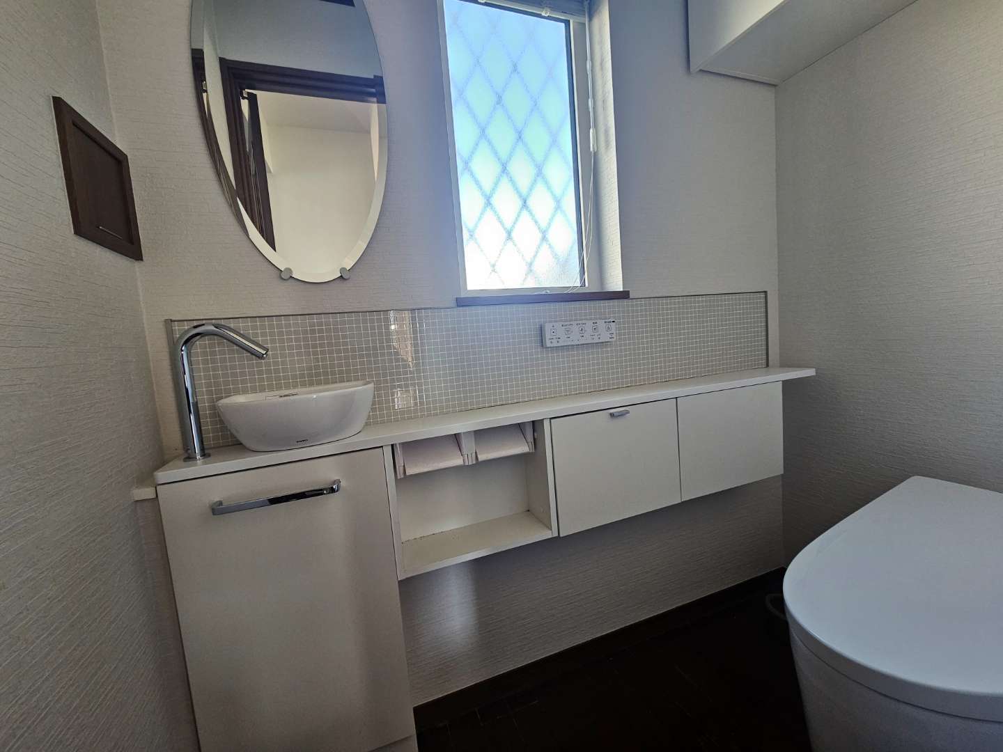 既存の鏡、吊戸棚も取り付けて終了しました。
