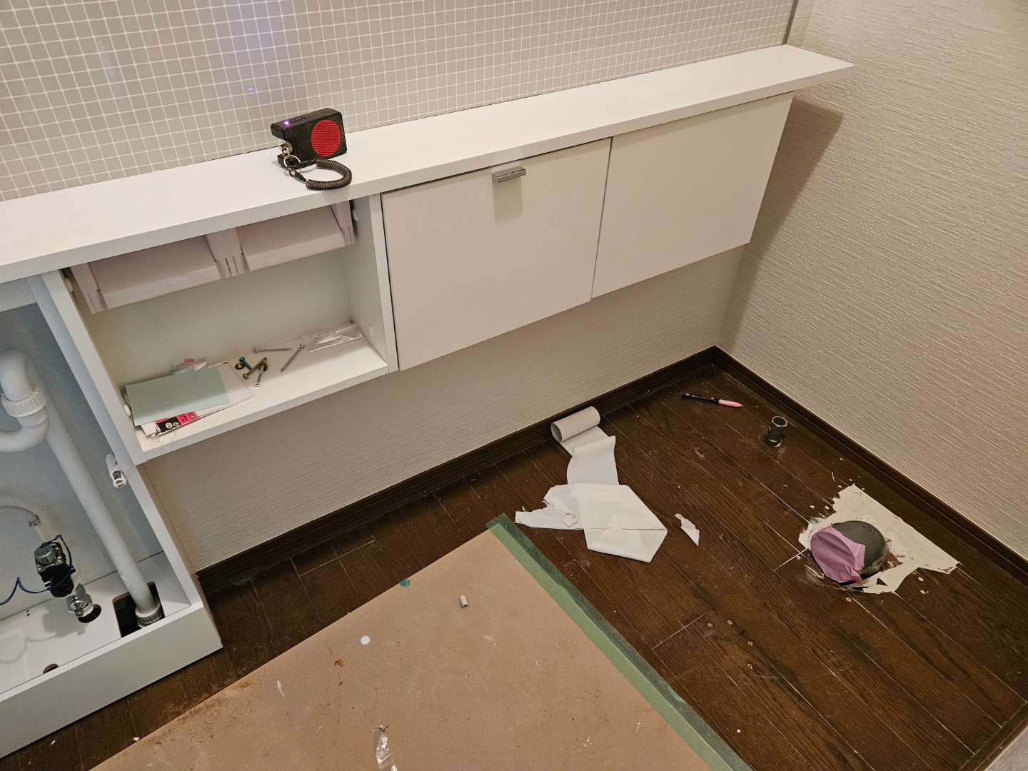 初めに手洗いなどの部材を取り付けました。