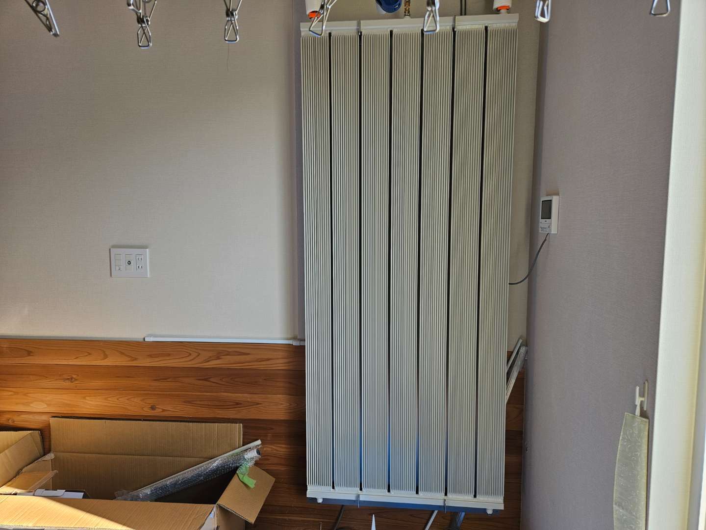 今日は暖かい一日になりました、先週から工事に入り今日で3日目になります築5年目のI様邸オールアルミニウム製輻射パネル冷暖房機工事を行いました、今日はテスト的に暖房運転を行なってみました。