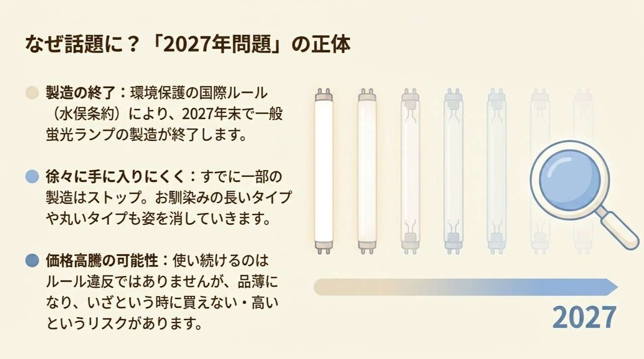 ニュースで言われている「2027年問題」とは、環境を守るための国際的なルール(水俣条約)によって、2027年末までに一般的な蛍光ランプの製造が終了するというものです。