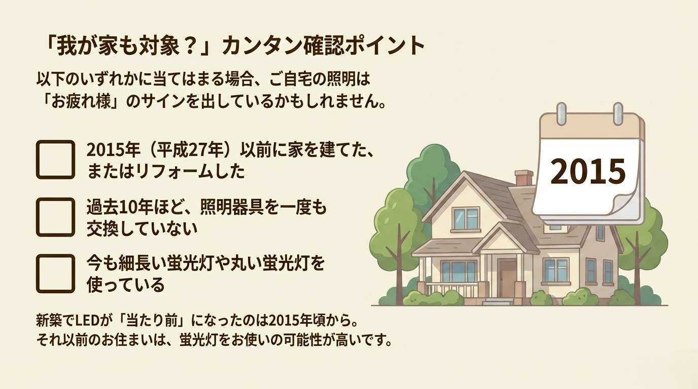 ひとつの目安として、「2015年(平成27年)以前に家を建てた、またはリフォームをした」というご家庭は、蛍光灯をお使いの可能性が高いです。