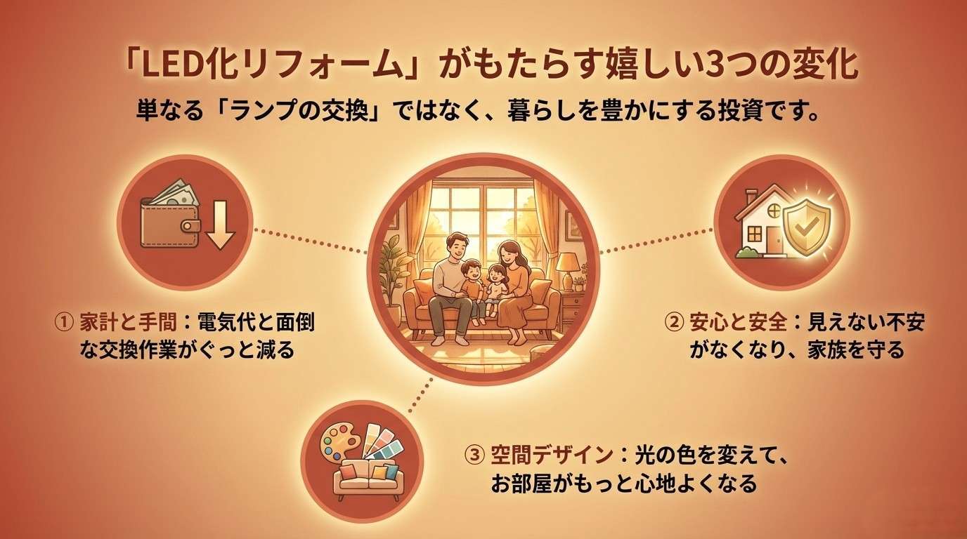 照明器具をまるごと新しくする「LED化リフォーム」。最初は少し費用がかかりますが、これからの長い暮らしを考えると、とても嬉しいメリットがたくさんあります。